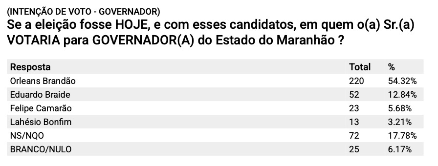 No levantamento, os moradores do município responderam à pergunta: “Se a eleição fosse hoje, e com esses candidatos, em quem o(a) Sr.(a) votaria para governador do Estado do Maranhão?”. O resultado foi o seguinte: