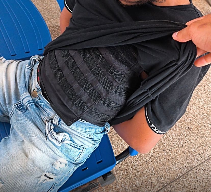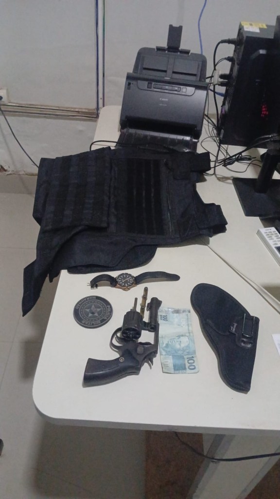 Ao chegar, os policiais encontraram o suspeito com as características informadas. Durante a abordagem, foi apreendido um revólver calibre .38 com três munições intactas, além de uma capa de colete balístico, um coldre, um relógio e uma quantia em dinheiro.